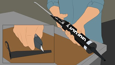 Use a hacksaw or sharp utility knife to cut the adhesive nozzle approx. 15mm (½”) from the tip before fitting the tube into the sealant gun.