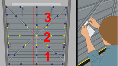 Place the double-sided adhesive pads in the centre of the markings. Then continue to distribute the adhesive pads evenly (use approximately 15 pads) across the bottom third of the garage door. Press down firmly on the pads to ensure a good bond.